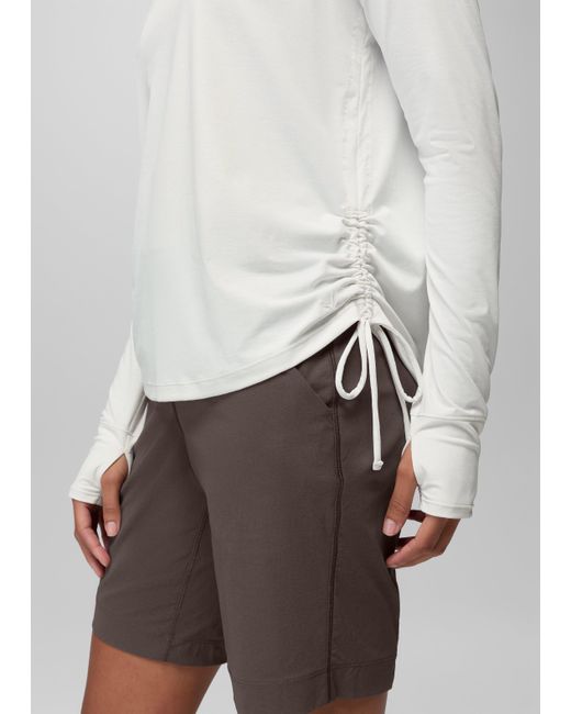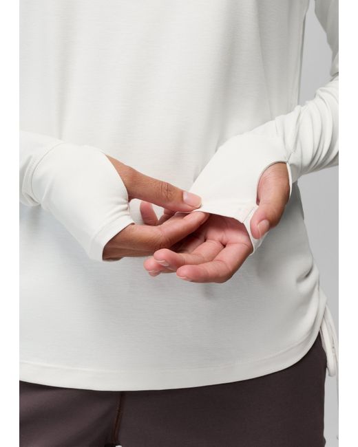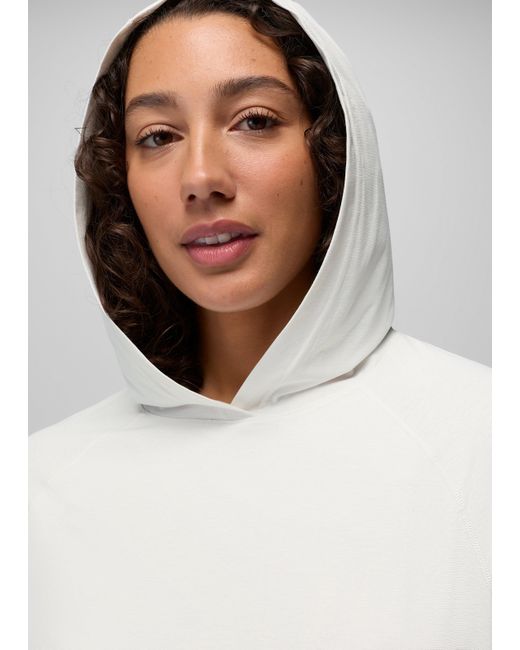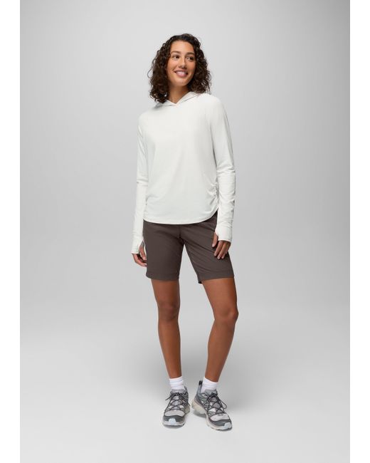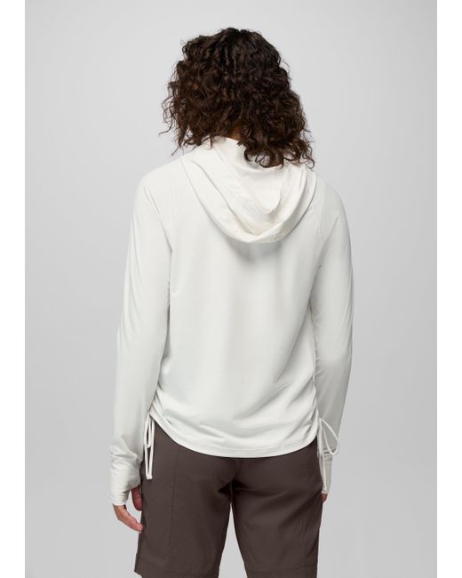 Sun protection combines with sporty style in this sunshirt with UPF 50+ coverage and functional cinch seams. Savor your favorite sunny day activities and stay protected from UV rays in the Eileen Hoodie, made with sustainable bluesign® approved fabric with a UPF 50+ rating. The soft, stretchy jersey mesh is quick to dry, whether you’re wearing it for water sports or working out on land. Cinchable side seams let you customize your look and bring effortless style to your sportswear. | Womens prAna Eileen Hoodie in White, Size XL