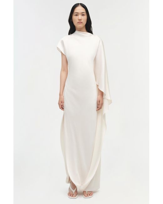 SPRING 2026 WOMEN'S COLLECTION The Ora Satin Gown in Ivory. This woven satin gown features an asymmetrical long sleeve, with cascading folds that form a striking, cape-like silhouette from shoulder to hem. This dress combines movement with statuesque presence. SIMKHAI Women's Ora Satin Gown in Ivory, Size 00