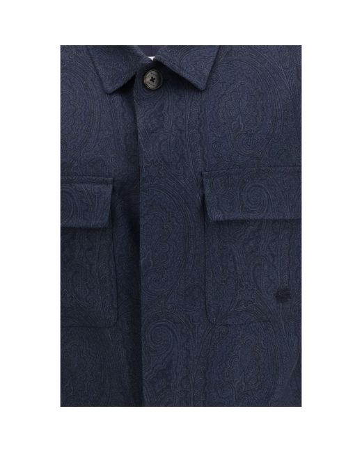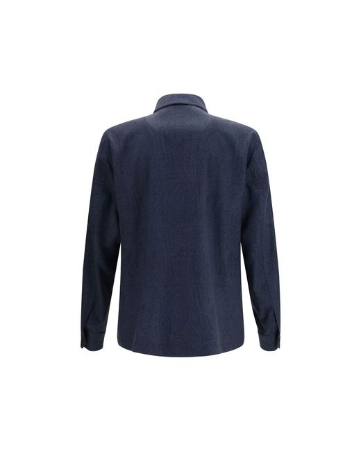 The pure wool Shacket by Etro elevates the classic shirt-jacket through a refined design enriched with the iconic all-over Paisley motif. The piece features two front patch pockets, one finished with a subtle tone-on-tone embroidered Pegaso, a signature detail of the House. The concealed button closure, with the first button left visible and adorned with the Etro logo, adds a touch of understated elegance. Completed with a pointed collar, working cuffs, and an easy fit, this shacket offers a versatile and sophisticated option for contemporary styling. Season: SS26 Fit: Regular Composition: OUTER 100% Wool INNER 52% Viscose 48% Acetate
