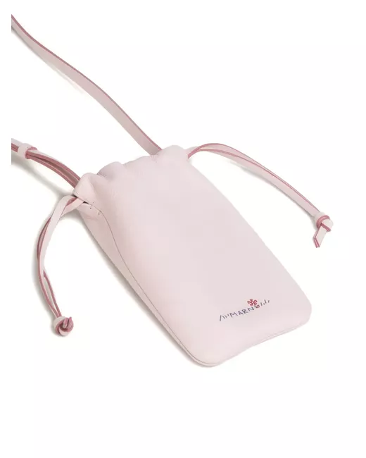 pink calfskin leather embroidered logo flower detail leather draw cords shoulder strap