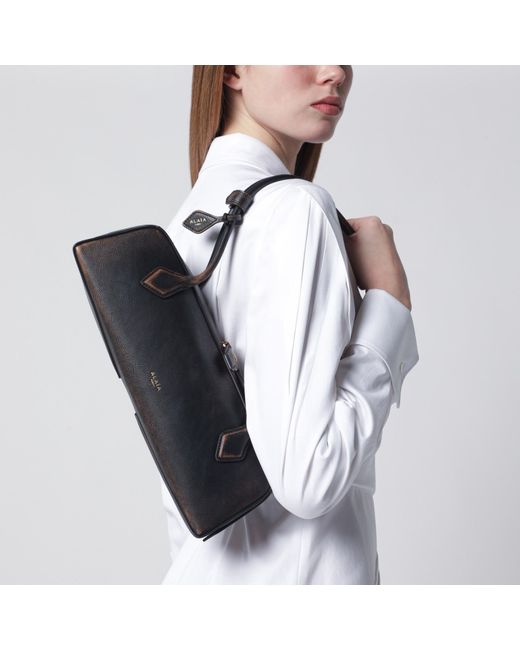 Alaïa medium bag in ebony aged-effect calfskin leather, featuring an elongated design, two long tubular handles, double zip closure, a small removable mirror in the internal pocket, and embossed lettering logo on the front.