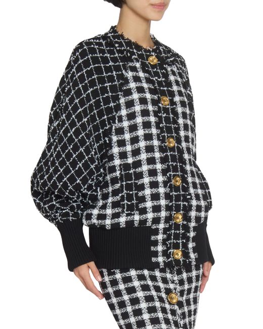 This Balmain bomber jacket is crafted of cotton with a tweed texture, showcasing a checked pattern, bishop sleeves, and a raw-edge hem. Band collar Bishop sleeves, ribbed cuffs and hem Side welt pockets Banded trim Button-front closure 100% cotton Dry clean Imported SIZE & FIT Model measurements: 5'10" tall Model is wearing a US size 2 Please note: This item runs large. We recommend ordering one size down. ABOUT THE BRAND In 1945, founder Pierre Balmain made his well-received debut of opulent, ultra-feminine designs. Known today for its iconic blazers, impeccably constructed dresses and signature fragrances, the brand continues its dedication to masterful tailoring and elegance under the helm of Creative Director Antonin Tron. Advanced Designer - Balmain > Balmain > Saks Fifth Avenue. Balmain. Color: Noir Blanc. Size: 8.