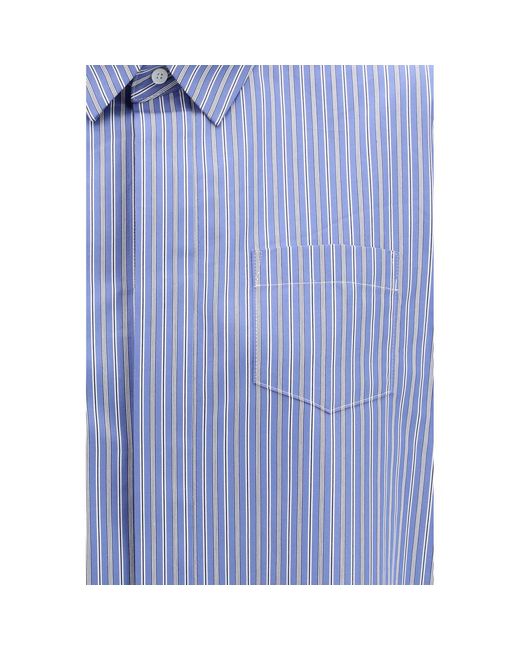 The striped poplin Shirt by Sacai stands out for its experimental design and bold volume. Featuring a concealed front button placket and a chest patch pocket, the piece maintains a clean and refined aesthetic. The very oversized fit defines a contemporary silhouette, enhanced by double-layer sleeves combining mesh and poplin. Applied panels along the sides and edges create a layered construction that highlights the brand’s distinctive and innovative approach. Season: SS26 Fit: Oversize Composition: 35% Cotton 65% Polyester