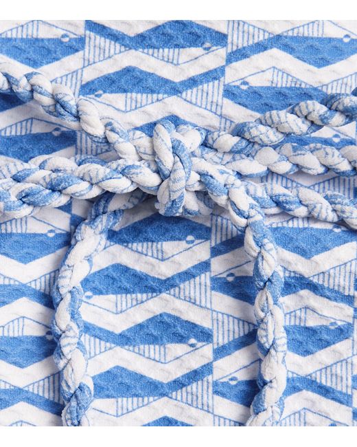 Though based in London, Heidi Klein’s designs eloquently channel a Grecian spirit through their expressive prints and resort-ready materials, as the Tinos bikini top so deftly illustrates. An all-over geometric print animates its triangle silhouette, elevated by lustrous heat-resistant silver-tone hardware and side rope ties that deliver an adjustable, practical finish.