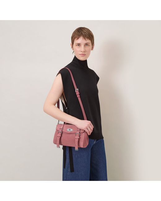 The Mini Alexa effortlessly combines elements from two iconic Mulberry styles: the Bayswater bag and the Elkington briefcase. The result is a miniature version of an understatedly cool satchel complete with the signature Mulberry Postman's Lock and belt buckle and strap hardware. Carry by the plaited leather top handle or wear with the adjustable cross body strap. Details: A mini version of the cult bag that epitomises laidback luxury. Silver hardware finish Postman's Lock closure Handcrafted braided top handle Adjustable and detachable leather strap One main compartment One internal slip pocket Height 17cm Width 22cm Depth 10cm Handle Drop 5cm Shoulder Strap 104cm Weight 0.6kg, approximately Material Suede A bovine suede which has been finished with a clear resin backing to give a smooth, contrasted appearance and improve functionality. This backing reduces colour and fibre transfer and allows for gentle cleaning of the material. This product's code is RL8995-047J647