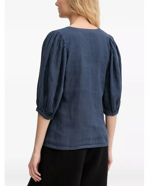 dark blue linen V-neck gathered detailing three-quarter sleeves
