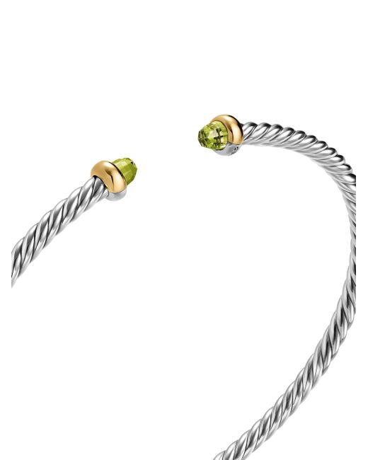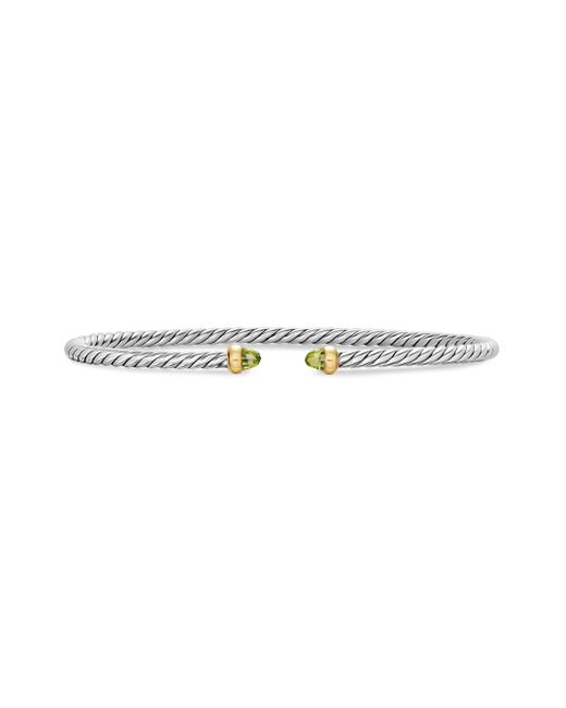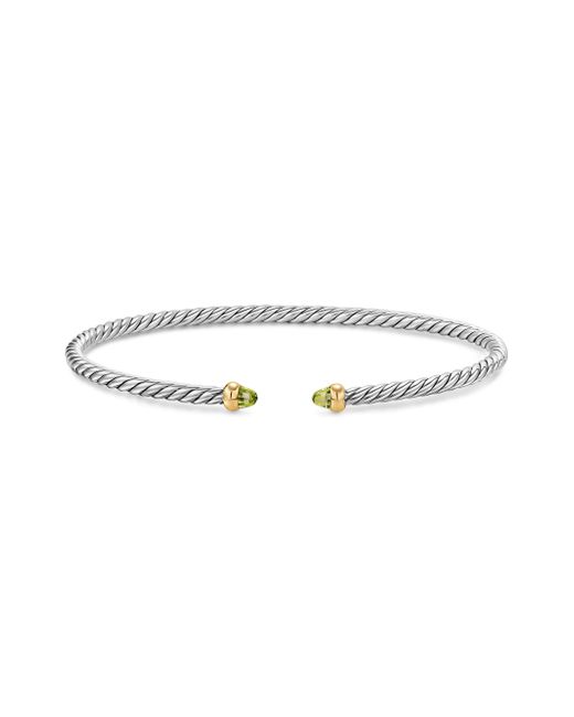 David Yurman's artistic signature, Cable began as a bracelet that he hand-twisted from 50 feet of wire. For the past 30 years, he has evolved the twisted helix into a myriad of designs. Sterling silver with 14-karat yellow gold Bracelet 2.6mm Nitinol core to provide flex movement Made in USA ABOUT THE BRAND David, a sculptor, and his wife, Sybil, a painter, launched their innovative jewelry brand in 1980 in New York City. Since then, the American design house has pioneered cutting-edge collections-from its iconic combination of sterling silver and diamonds to signature pinky rings. Today, with their son Evan, the Yurmans continue to deliver timeless pieces inspired by nature, art, ancient symbols and Manhattan's stunning architecture. Lsd Jewelry - David Yurman > David Yurman > Saks Fifth Avenue. David Yurman. Color: Peridot. Size: XL.