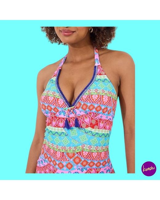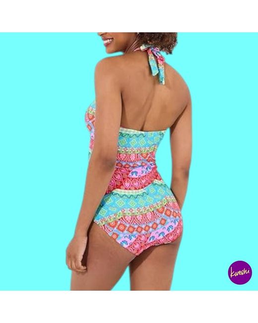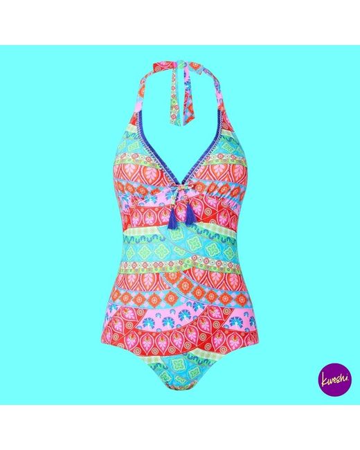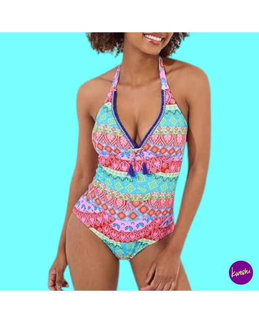 • Label Size: UK 14 | EU 42 | US 10. • Colour: Blue Multi. • Classic fit one-piece with stretch recycled fabric. • Pull-on style, fully lined for comfort and shape retention.