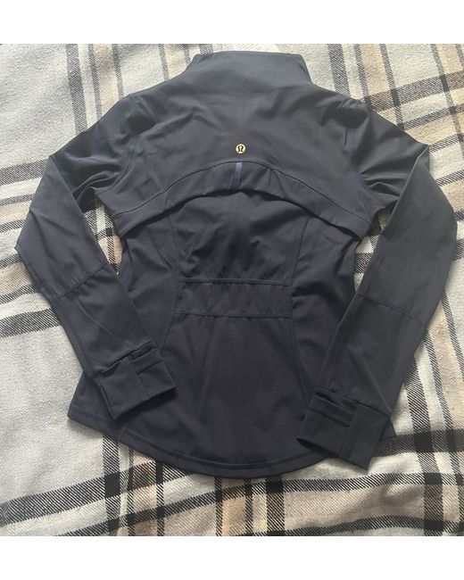 The Lululemon Women's Navy Gold Zipper Define Jacket is a stylish activewear jacket made from a blended fabric of nylon and polyester. Designed for women size 6, this long-sleeve jacket features a zip closure and is machine washable. Perfect for spring, the jacket is ideal for yoga and other sports activities. With its sporty theme and sleek design, this Lululemon Define jacket is a must-have for women looking for both style and functionality in their activewear wardrobe.