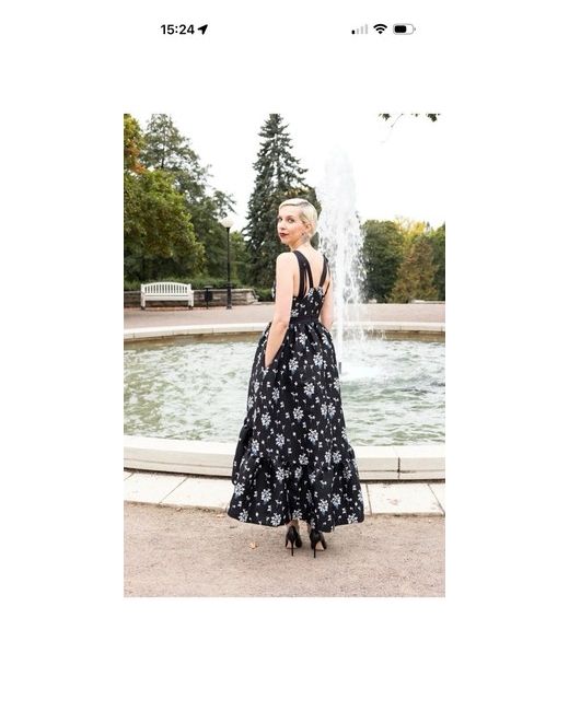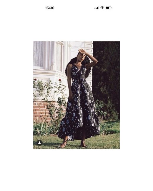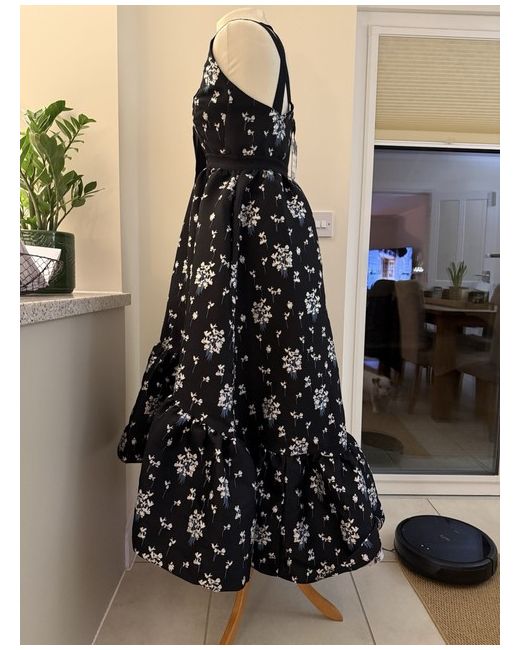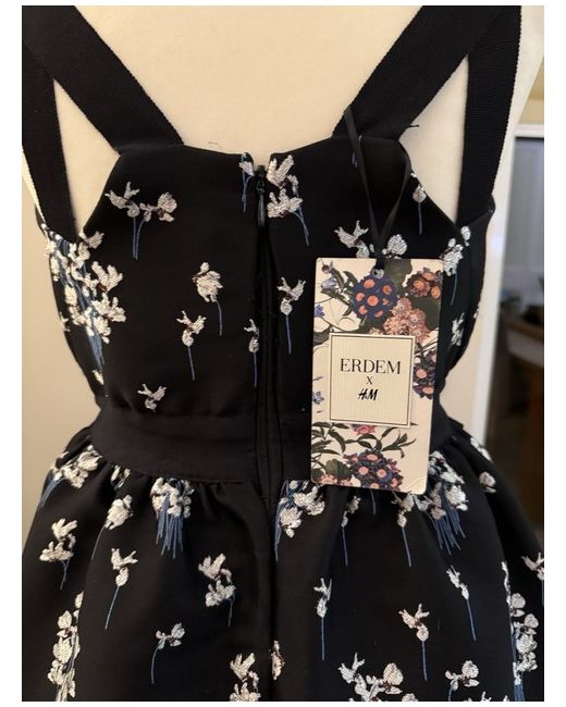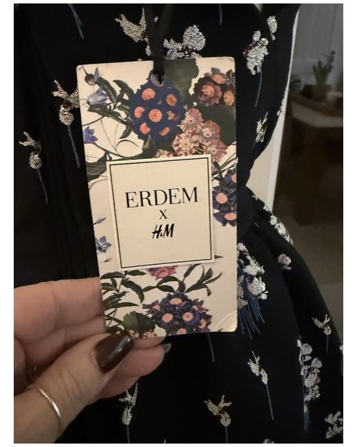 A truly stunning show stopping evening dress from erdem a collaboration with H&M in 2017 the quality is outstanding dips lower at the back from the front the colours are amazing black with silver blue and burgundy sparkly in the light you’ll feel a million dollars in it it is also partly lined others selling on here for over £600
