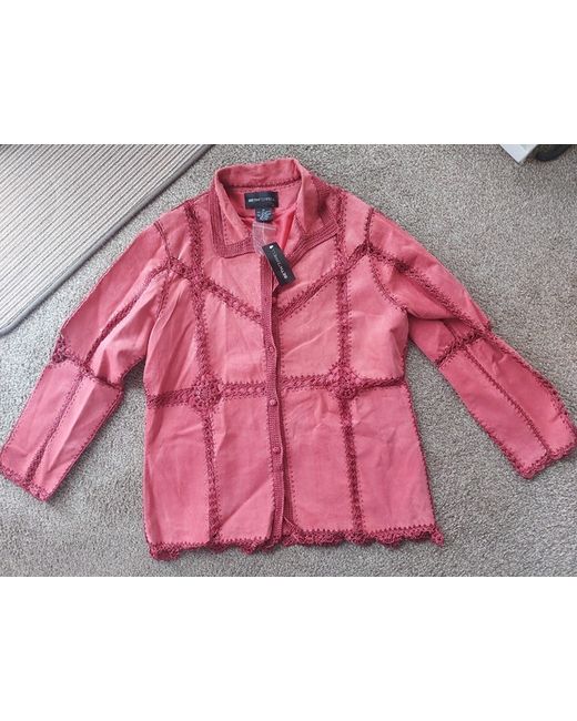 brand new with tags, lovely coral pink coloured suede jacket. size medium. 44" chest. please see photos for all other measurements. New with tags It has a tiny lighter coloured bit on the suede, although I think this is natural part of it, I have highlighted in the last photo (this is pretty much unnoticeable, but I am mentioning for accuracy) the colour of the coat is more accurate on the photos where the pink appears darker. please also be aware rhe brightness and colour on different people monitors can make a difference of how the colour appears.