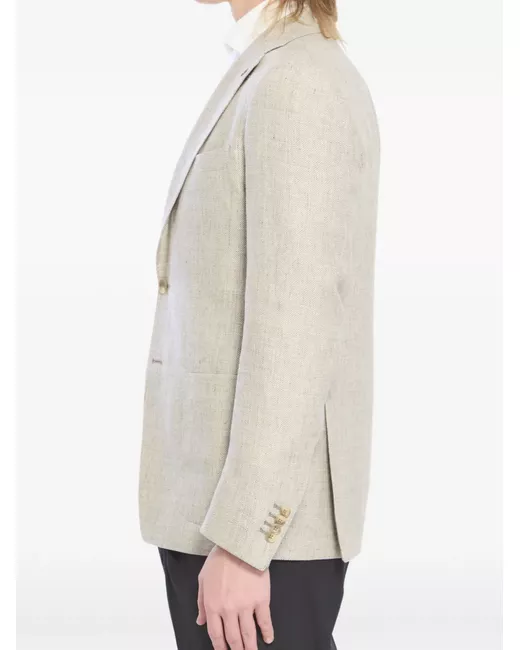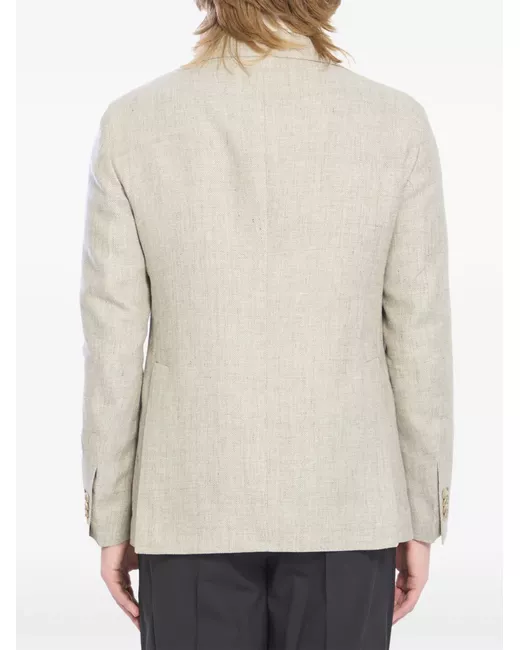 beige v-cut lapel pin detail patch pockets buttoned cuffs back vents