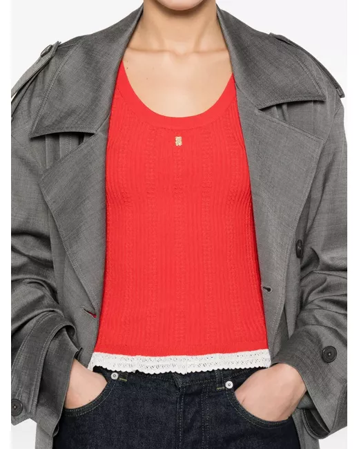 red ribbed knit lace trim sleeveless round neck