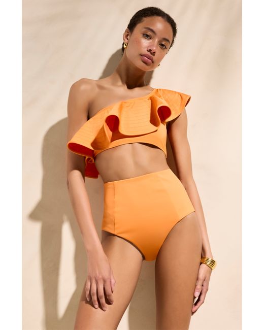 Old world glamour meets contemporary construction in our retro-inspired Micha bottom, which sits higher on the waist and lower on the leg. The double-seam front, full-coverage back, and lined compression fabric creates a fit that holds you in and stays in place for all-day fun in the sun. Micha is pictured here in bright Apricot and pairs back to our matching Doris top with a dramatic one-shoulder ruffle.. High-rise swim bottom. Full brief coverage. Front seam panel detailing. Scoop leg. 56% nylon, 44% spandex with light compression. Fully lined. Care instructions: Our swimsuits are machine washable, but we recommend hand washing to keep the fabric and shape of the suit looking newer, longer