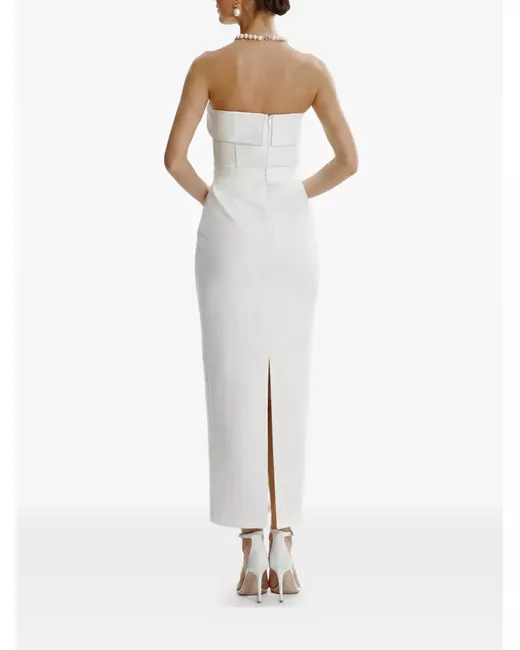 white strapless back zip fastening back slit fitted waist midi length