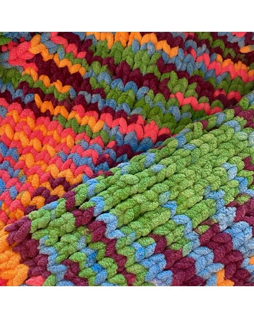 Bold and eye-catching hand-knitted jumper made from soft, chunky chenille yarn in vibrant multicolour rainbow tones. • Bright multicolour / rainbow design. The plush chenille texture gives the jumper a luxuriously soft feel while remaining warm and substantial.