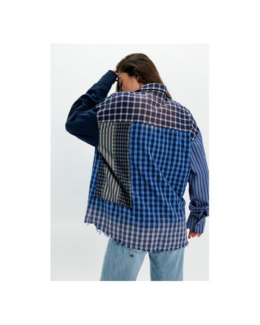 Blue Patchwork Check Stripe Button Down
