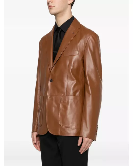brown leather notched lapels front button fastening chest welt pocket two patch pockets