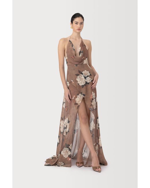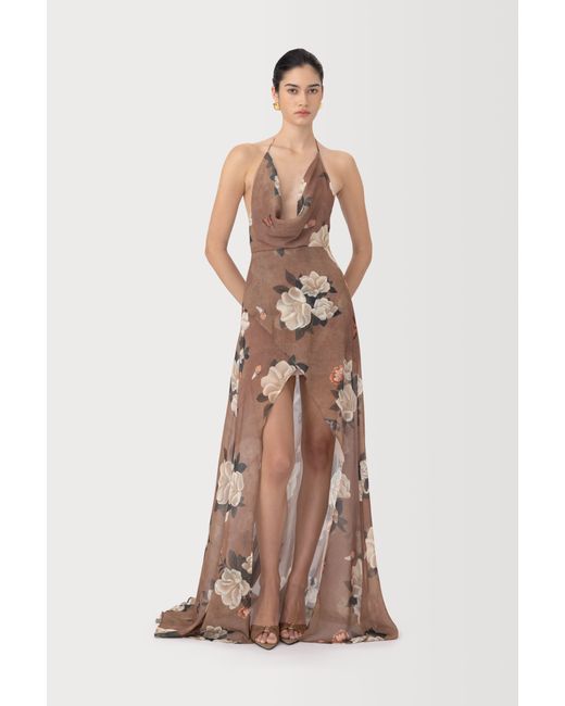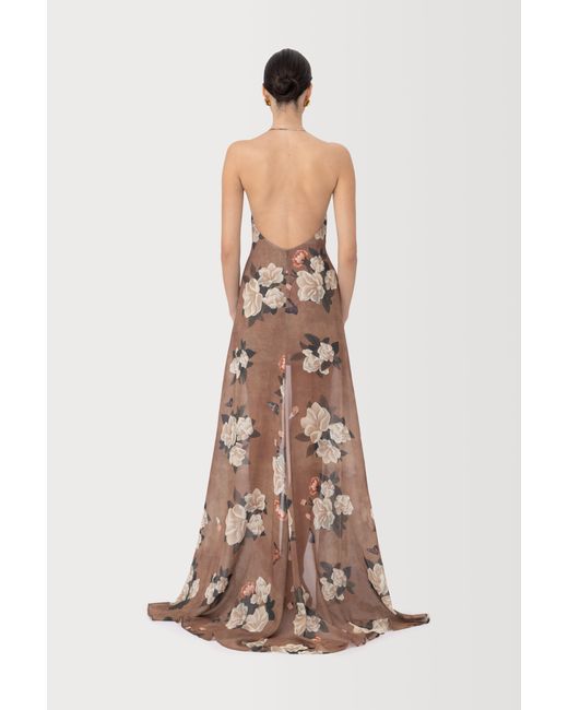 Crafted from soft chiffon, the Cairo dress maxi piece featuring an exclusive in-house hand-painted magnolia print. Designed with a deep cowl drapes neckline and a sleek open back. The flowy silhouette is cut short in the front and extends into a longer length at the back. Layer it with the Etta corset for a complete ensemble.
