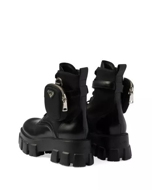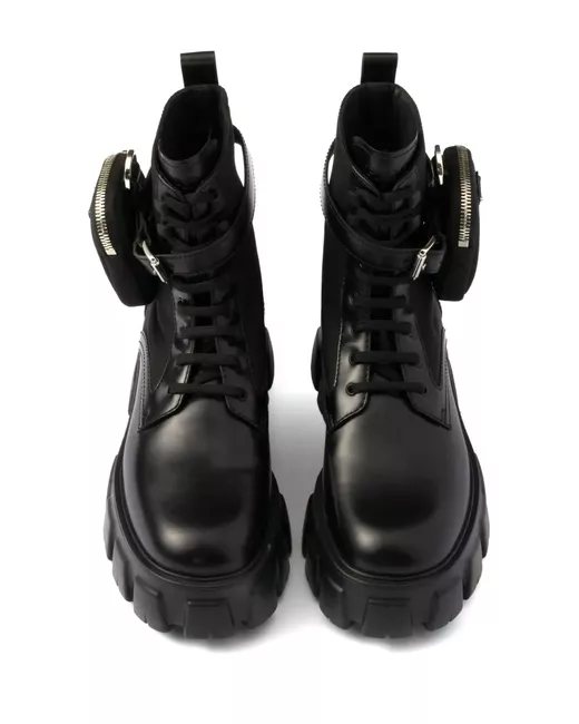 black calf leather panelled design front lace-up fastening ankle-length pull-tab at the heel removable pouch round toe branded insole leather lining chunky rubber lug sole