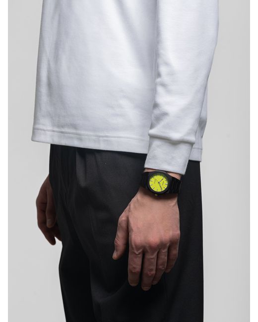 Built from durable polycarbonate, this 40.5mm case model features a lucid yellow brass dial and anti-reflective mineral glass. The integrated strap is shaped for a precise fit, resulting in a lightweight, contrasting design that prioritizes comfort.