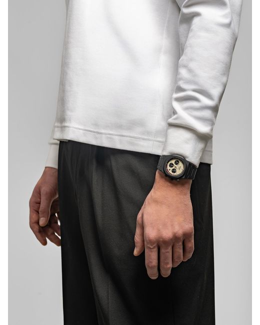 This 40.5mm case model features a polycarbonate case and a off-white brass dial. Protected by anti-reflective mineral glass, the curved integrated strap ensures a comfortable fit, maintaining a modern silhouette encompassing chronographs.