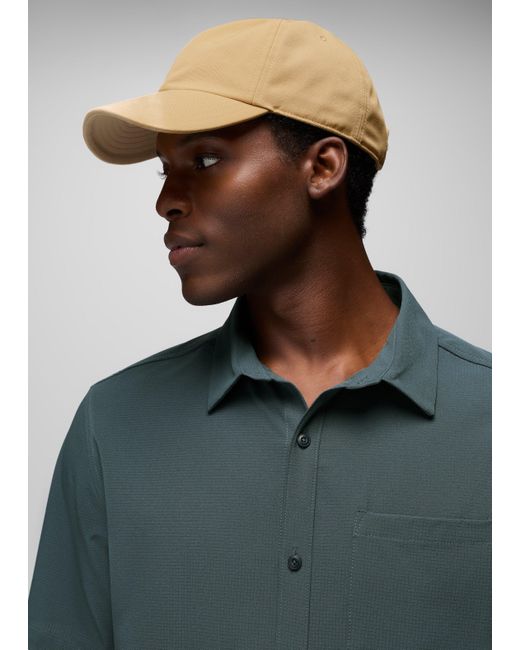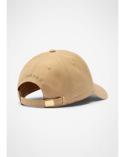 A simply stylish, adjustable hat made with recycled materials and UPF 50 coverage. Embrace simplicity with the Clean Function Hat. Made from recycled materials with a UPF 50 rating, this sleek baseball cap features a curved brim, adjustable back buckle for finding your perfect fit, and a subtle, tonal prAna logo embroidered on the back. | Gender Neutral prAna Clean Function Hat in Tan, Size One Size