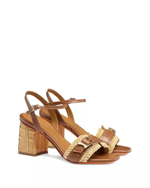 brown raffia detailing buckle fastening ankle strap leather footbed woven block heel