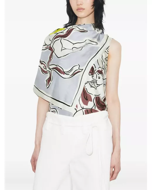 The silk cape top is printed with the season's hand-drawn cherub print, inspired by Renaissance paintings. A versatile piece, designed with a removable silk scarf that can be worn different ways. 100% silk hidden back zipper with hook-and-eye closure removable silk scarf worn multiple ways with button attachment length: 26.9" (68.4cm) based on size 2 lilac draped design