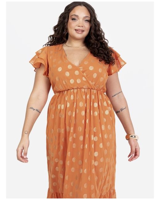 Women's Silver Orange V Neck Flutter Sleeve Metallic Detail Midi Dress