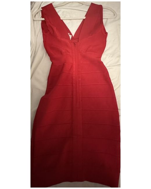 Size s Perfect silhouette Red dress !! Deep v front / low back neckline Bandage knit that widens and tapers for hourglass effect Hem hits above the knee that goes well with black heels perfect for a date or girls date Material: 86% Rayon 13% Nylon 1% Spandex