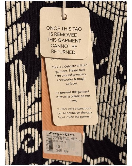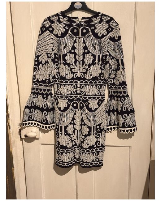 Authentic Alice McCall "La Java" Knitted Mini Dress Beautiful designer piece with a striking knitted print, originally purchased from Morgan Clare. This dress is brand new and has never been worn, featuring elegant bell sleeves and a high-quality textured knit. Condition: Brand New with Tags (BNWT). RRP: ÂŁ345.00 (Original tag attached). Size: UK 10. Colour: Navy Blue / White. Detailed Measurements (Laid Flat): Shoulder to Shoulder: 14.5" Total Length: 34" Outer Sleeve: 24" Underarm to Cuff: 15" Underarm to Hem: 24"