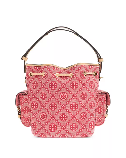 red Double T monogram pattern single top handle detachable adjustable shoulder strap drawstring fastening side flap pockets main compartment
