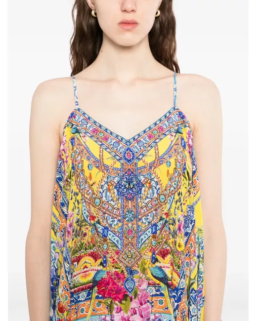 yellow and multicolour silk floral print asymmetric hem v-neck shoulder straps
