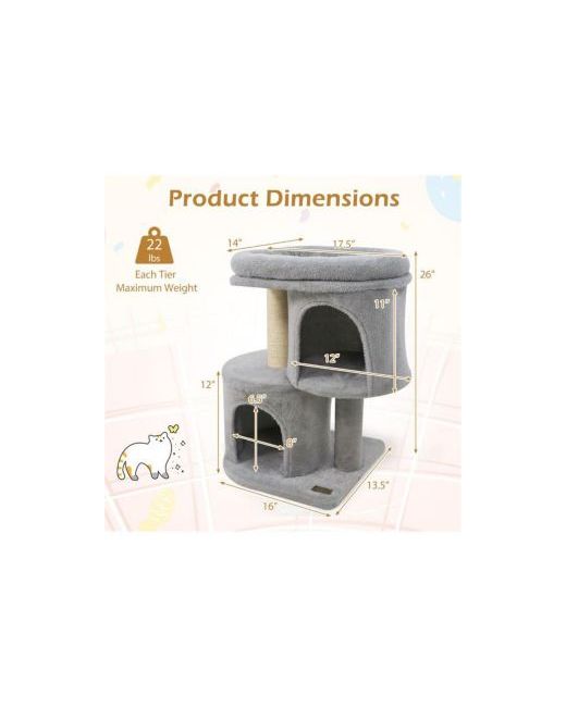 Crafted for comfort, security, and space-saving design, this Compact Multi-Cat Tower offers a complete activity and rest station for your feline family—perfect for homes with one or more cats. The tower is topped with a softly padded perch lined with gentle, skin-friendly fabric, giving your cat a cozy lookout spot to nap, observe, or soak up the sun. Below, two spacious condos provide private hideaways where cats can retreat for undisturbed relaxation, making it an ideal solution for multi-cat households. To support natural scratching instincts, the tower is fitted with durable sisal-wrapped posts that are both resilient and kind to claws, helping redirect scratching away from your furniture. Engineered with safety in mind, the structure features a weighted wide base and an anti-tip mechanism that work together to deliver outstanding stability, safely supporting cats up to 29 lbs (13 kg).