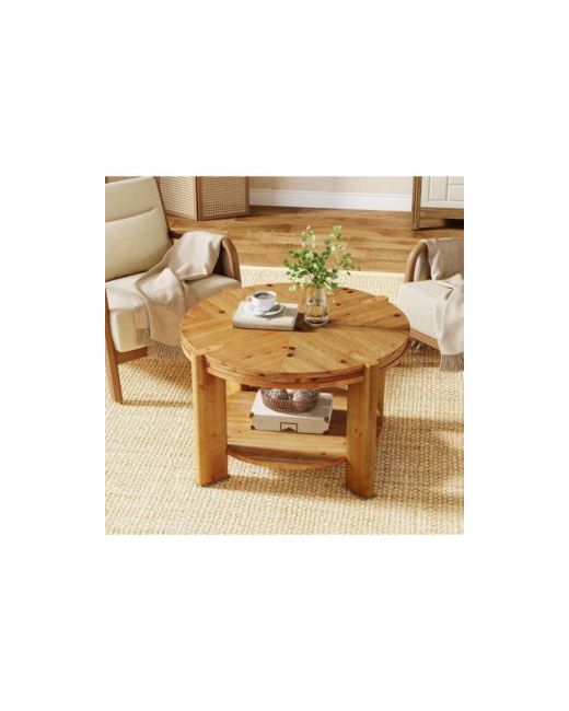 Elevate your living room with the Tribesigns Round Coffee Table, a piece that celebrates artisanal woodwork and functional design. The table's standout feature is its beautiful inlaid top, where carefully joined pieces of solid timber form a captivating radial pattern, accentuated by the wood's warm character marks.