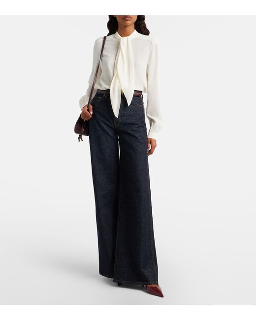 Material: 100% viscose. Care instructions: dry clean. Made in China. Designer color name: New Ivory. Contains non-textile parts of animal origin. Closure: concealed button placket. Self-tie neck. Cuff: one button.