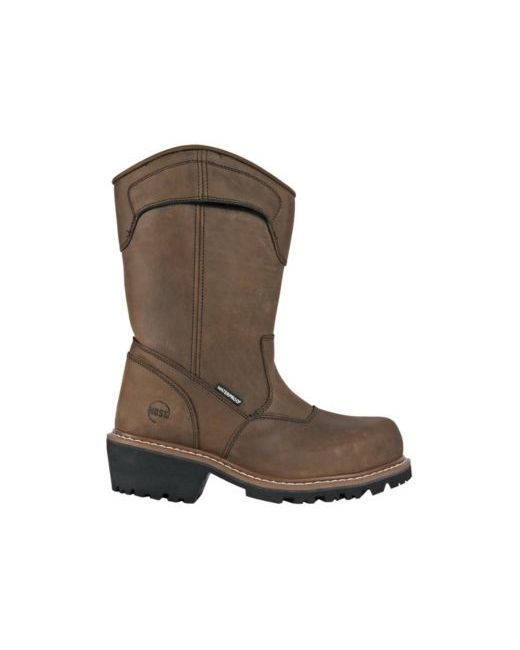 Built for rugged outdoor and industrial job sites, the Hoss Buford Logger Pull On Composite Toe Work Boot delivers heavy-duty protection, traction, and all-day comfort in a classic pull-on logger design. The work boot features a composite safety toe certified to Astm F2413-18 M/I/C Eh Pr, providing dependable impact, compression, electrical hazard, and puncture-resistant protection in a non-metallic build. The full-grain leather upper offers exceptional durability with a traditional logger look, while pull-on handles allow easy entry and removal. A waterproof membrane helps keep feet dry in wet conditions. Underfoot, a puncture-resistant midsole and triple-ridge steel shank add stability and protection on uneven terrain. The high-abrasion Hoss logger rubber outsole delivers aggressive traction, while a contoured cushion insole supports comfort during long workdays. Designed for logging, construction, and heavy industrial work, the Buford Logger is built to perform in tough conditions.