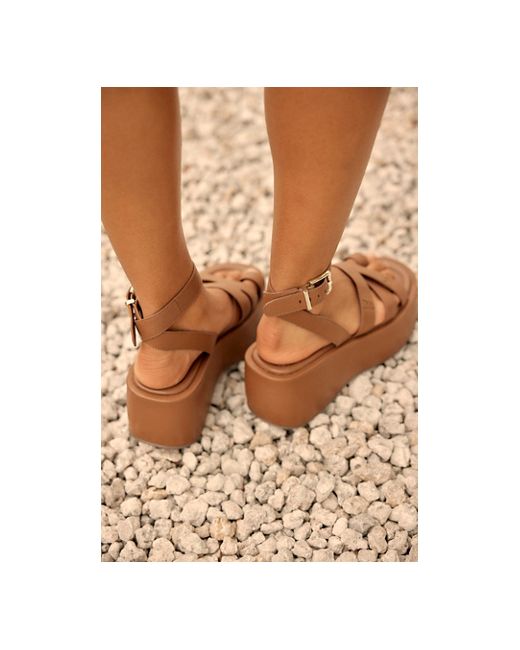 Simple and strappy, these platform sandals feature a lifted sole with a toe loop, criss-cross upper, and a buckle ankle strap. **Features:** Slip-on style, leather uppers, strappy design, toe loop, adjustable buckle ankle strap, flatform sole, lined footbed **Why We Hazel Flatform Sandals by Free People in Latte, Size: US 6