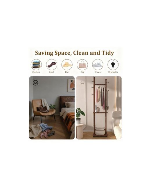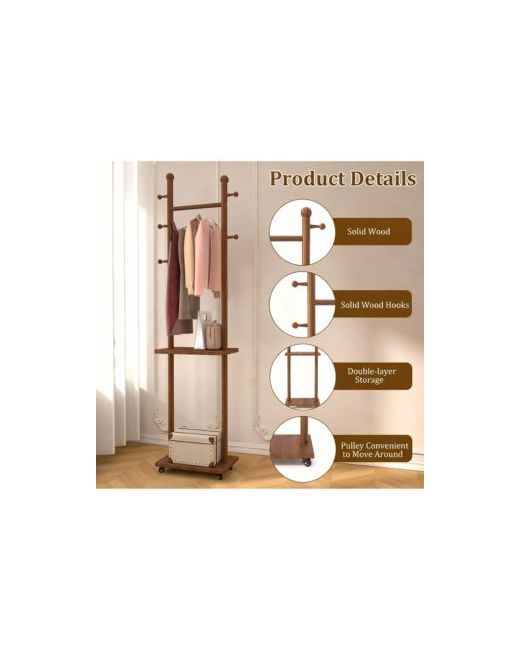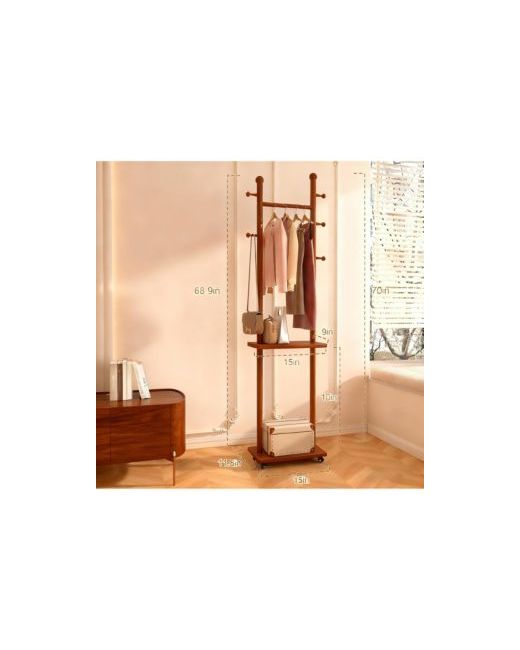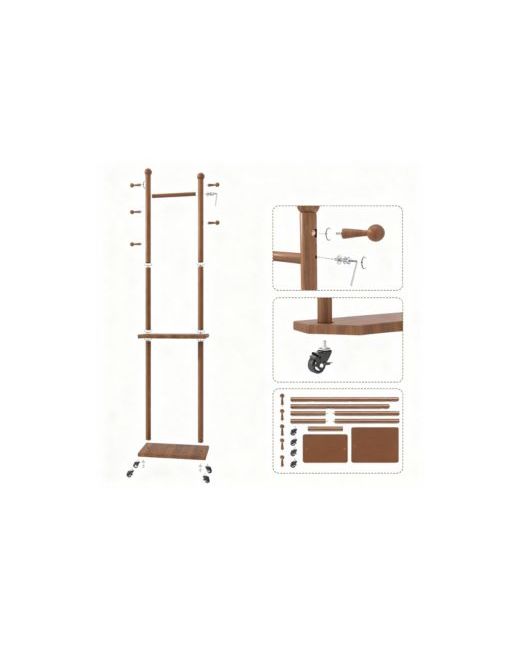 Solid wood coat rack in warm walnut-tone rubberwood, strong and stable, resists moisture and wear. Five hooks, long hanging rail, two lower shelves for bags or shoes. Four quiet 360° wheels glide smoothly and lock in place remove them for a cleaner look. Freestanding unit fits bedroom, hallway, office, or small apartment. Threaded joints, one screwdriver, fifteen-minute assembly. Length: 9.00 inch. Width: 16.00 inch. Height: 70.90 inch. Weight: 0.02 pounds.