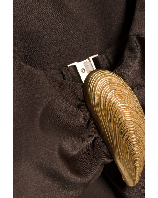 SPRING 2026 WOMEN'S COLLECTION The Veyra Shell Bikini Top in Chocolate. Made from smooth stretch fabric, this bikini top has a soft square neckline and a lightly supportive fit. The central shell accent defines the form, creating a refined, sculpted look. Pair it with the Gracie Shell Bikini Bottom in Chocolate to complete the look. SIMKHAI Women's Veyra Shell Bikini Top in Chocolate, Size XS