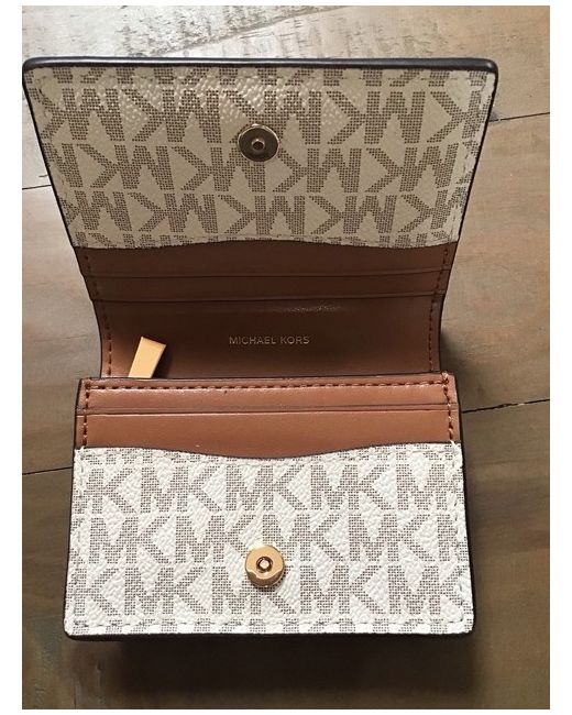 Michael Kors Hamilton small signature logo wallet purse Gold tone hard ware Vanilla/Acorn 4.25”W. 3”H. 1.5”D New in the box. Small Credit cards Small coin section Back compartment. Authentic