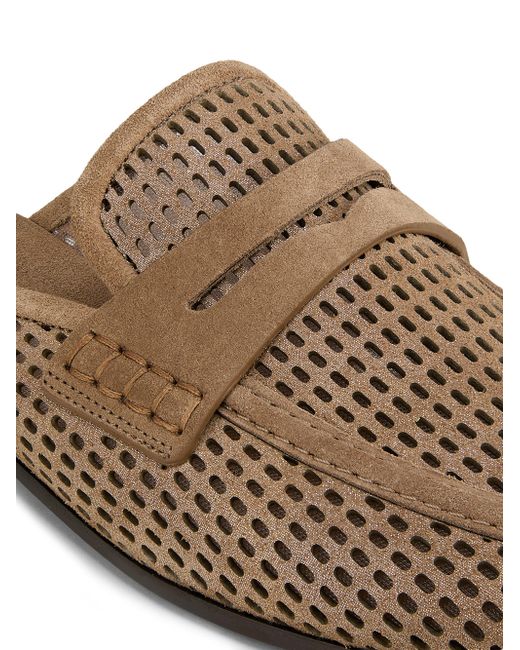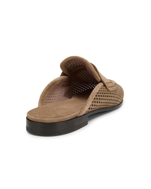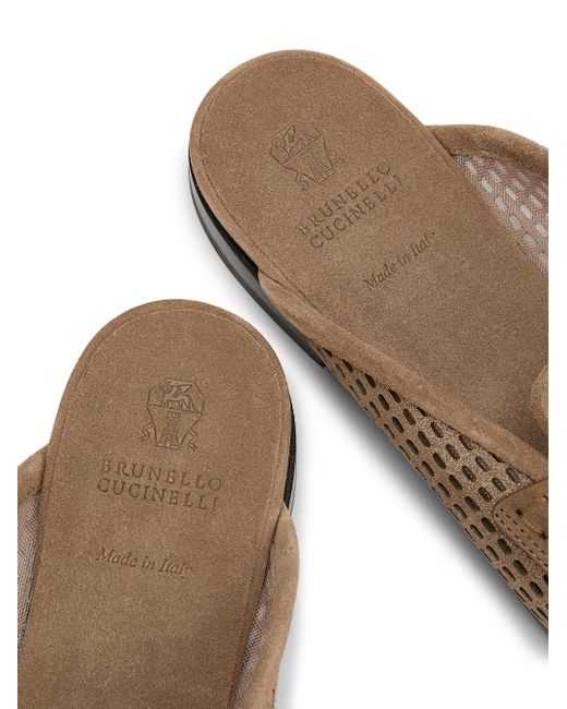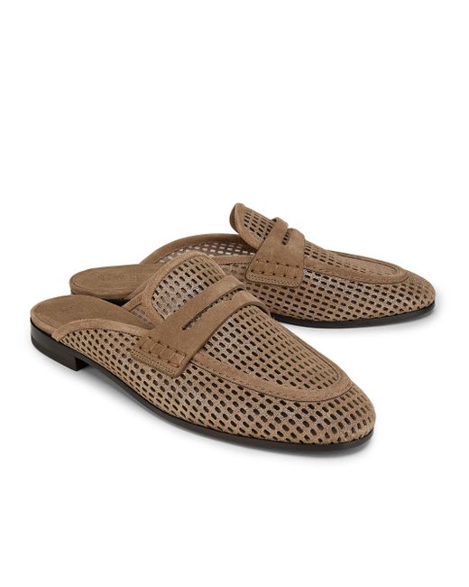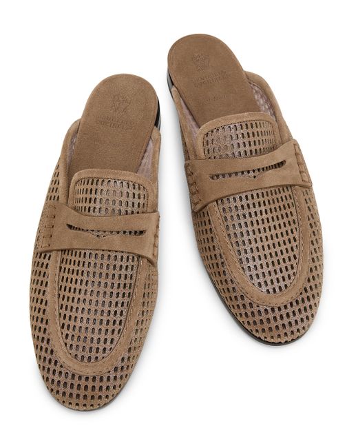 Made in Italy, Brunello Cucinelli's penny loafer-inspired mules are crafted of a laminated suede and feature a sparkling perforated design. Almond toe Slips on Suede upper Leather sole Made in Italy ABOUT THE BRAND Beginning with a focus in masterfully constructed cashmere pieces, Brunello Cucinelli's namesake heritage label quickly grew to be synonymous with fine Italian craftsmanship and casual luxury. Every sumptuous piece of knitwear or impeccably tailored separate is made in his studio in Solomeo, a 14th-century Italian village he worked to restore and rebuild. Women's Shoes - Brunello Cucinelli > Brunello Cucinelli > Saks Fifth Avenue. Brunello Cucinelli. Color: Chestnut. Size: 6.5.