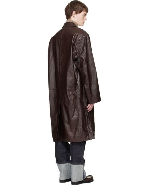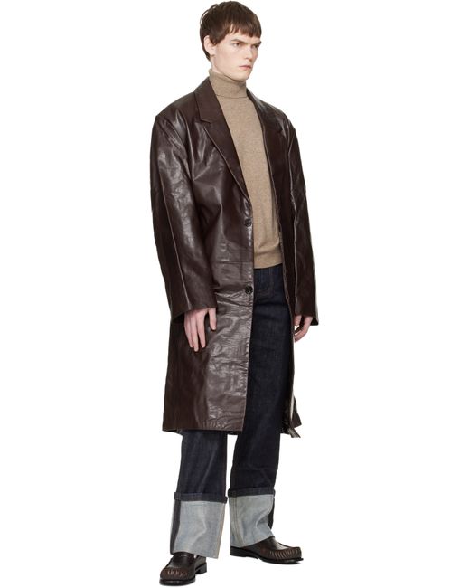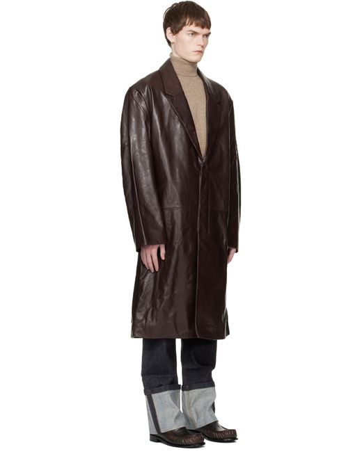 Paneled creased leather coat. · Notched lapel · Concealed button closure · Welt pockets at waist · Padded shoulders · Central vent at back hem · Welt pocket at interior · Satin lining Supplier color: Dark Brown