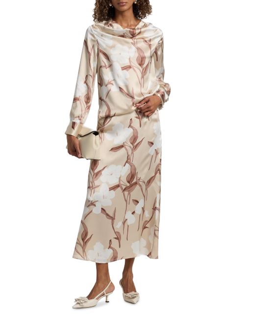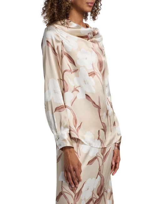 This blouse from Misook is crafted of floral-printsilk and styled with a drapeneck. Drapeneck Long sleeves, button cuffs Shirttail hem Pulls over 100% silk Dry clean Imported SIZE & FIT About 26" from shoulder to hem Model measurements: 5'10" tall Model is wearing a US size Small. Modern Collections - Modern Coll > Misook > Saks Fifth Avenue. Misook. Color: Biscotti Charmeuse White. Size: Small.