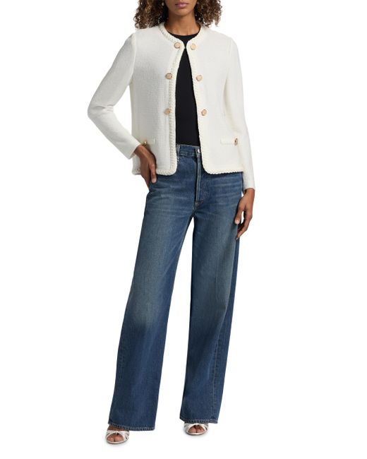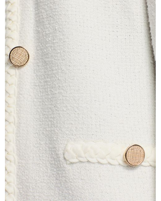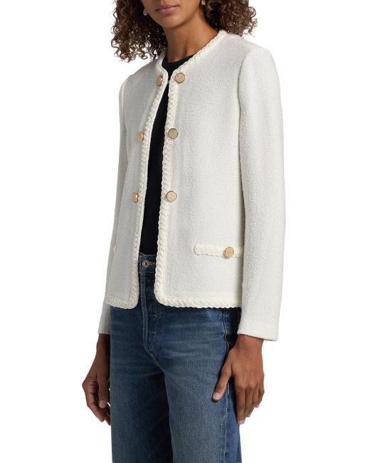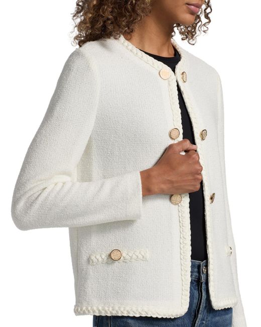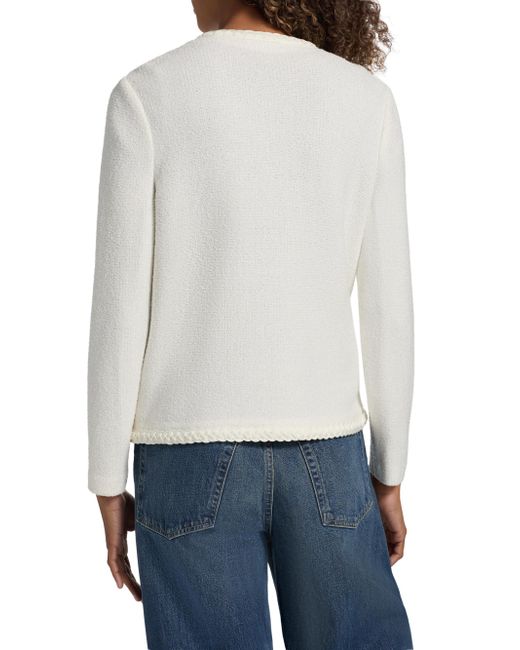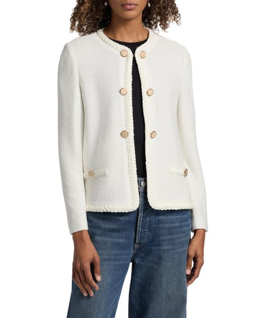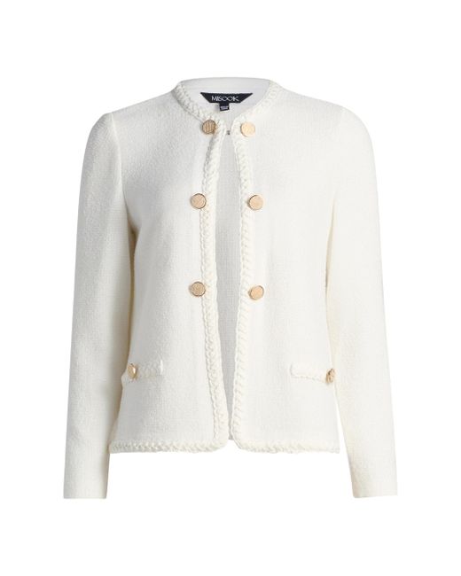 This Misook knit jacket features a stand collar, shoulder pads, and a braided trim. Stand collar Padded shoulders Long sleeves Button-front closure 52% acrylic/28% nylon/11% viscose/9% rayon Hand wash Imported SIZE & FIT About 23" from shoulder to hem Model measurements: 5'10" tall Model is wearing a US size Small. Modern Collections - Modern Coll > Misook > Saks Fifth Avenue. Misook. Color: New Ivory. Size: Small.