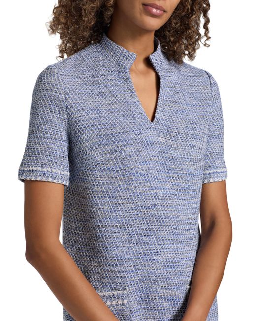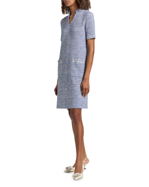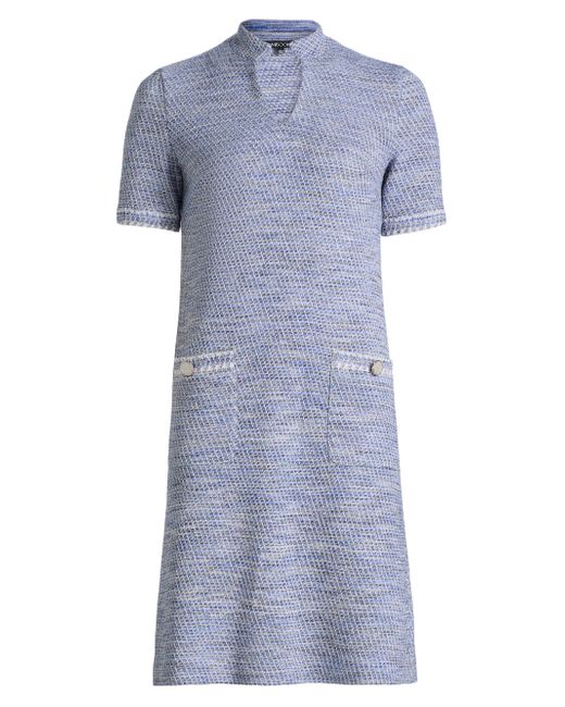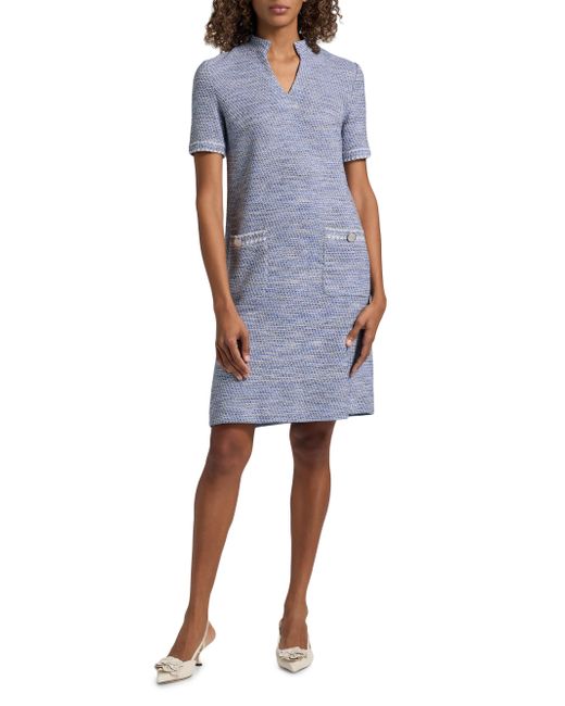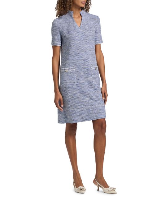 Cut in a shift silhouette, this Misook knee-length dress is crafted of tweed and styled with a stand collar. Stand collar Short sleeves Front patch pockets Pulls over 74% acrylic/11% rayon/7% nylon Machine wash Imported SIZE & FIT About 37" from shoulder to hem Model measurements: 5'10" tall Model is wearing a US size Small. Modern Collections - Modern Coll > Misook > Saks Fifth Avenue. Misook. Color: Aegean Biscotti White Black. Size: Small.