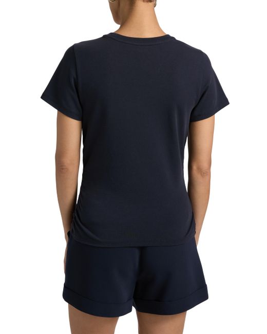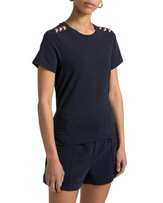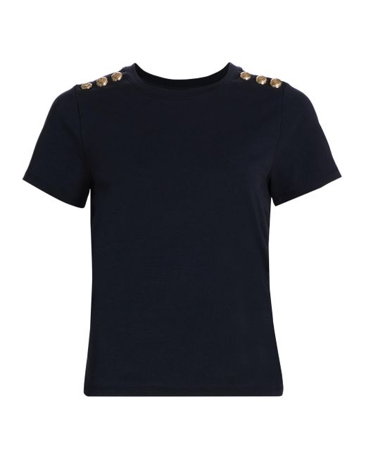 Crafted of stretch cotton, this Cinq á Sept T-shirt is styled with buttons on the shoulder. Crewneck Short sleeves Pulls over 94% cotton/6% spandex Dry clean Imported SIZE & FIT About 22" from shoulder to hem Model measurements: 5'10" tall Model is wearing a US size Small ABOUT THE BRAND Inspired by the radiant, magical hours between 5 and 7 PM-which is what the label's French name translates to-founder Jane Siskin designs sophisticated, feminine pieces for both workweek and the weekend. The designer's silhouettes also play with volume and eye-catching trimmings-perfect for cocktails or a special night out. Contemporary Sportswear - Denim And Bottoms > Cinq à Sept > Saks Fifth Avenue. Cinq à Sept. Color: Navy. Size: XS.