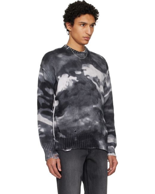 Knit cotton sweater. · Distressing and printed camouflage pattern throughout · Rib-knit crewneck, hem, and cuffs · Embroidered logo at chest · Exposed seam at sides and sleeves · Dropped shoulders Supplier color: Grey