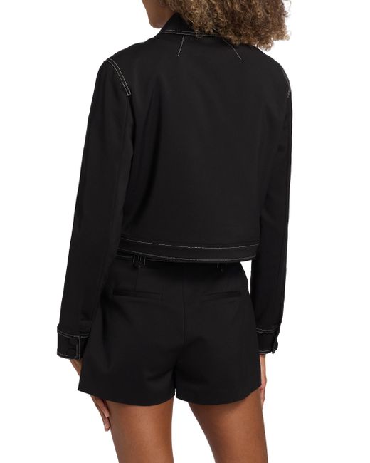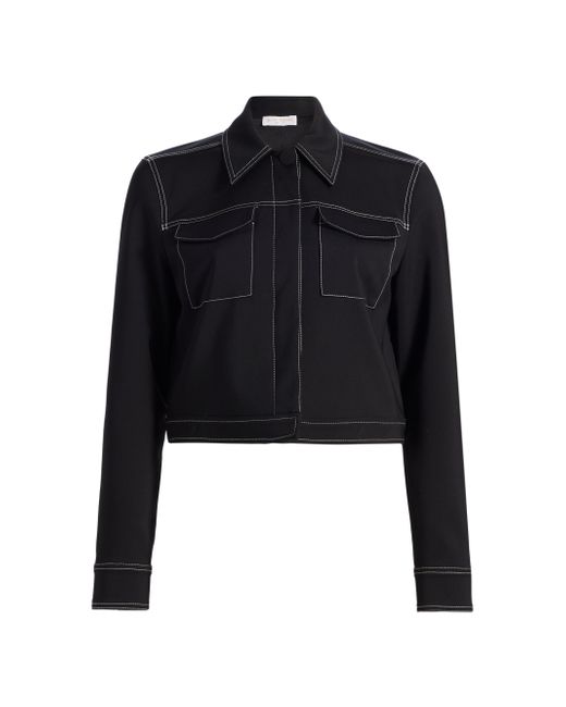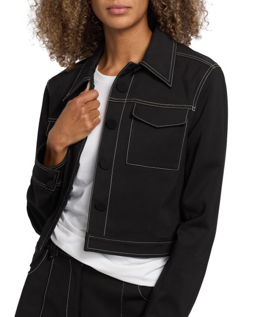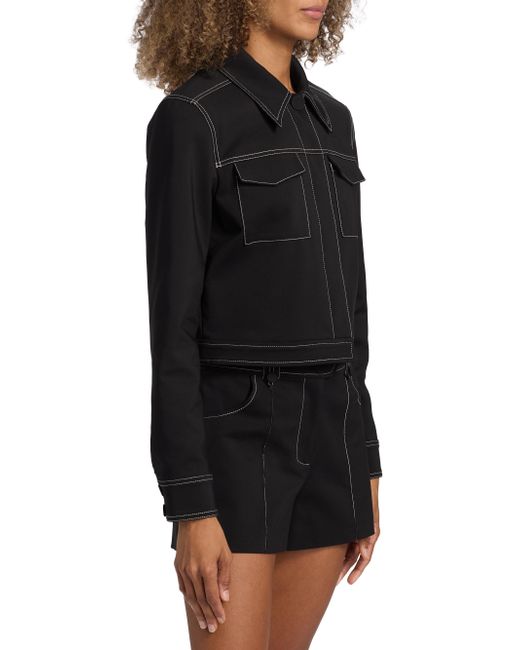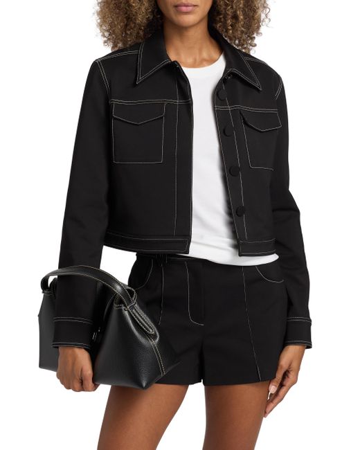 The Marrie trucker jacket from Ramy Brook is crafted of a stretch cotton-nylon and accented with contrast stitching. Point collar Long sleeves Chest flap pockets Concealed button-front closure 60% cotton/37% nylon/3% spandex Lining: 100% polyester Dry clean Imported SIZE & FIT About 25" from shoulder to hem Model measurements: 5'10" tall Model is wearing a US size Small. Contemporary Sportswear - Contemporary Collections > Ramy Brook > Saks Fifth Avenue. Ramy Brook. Color: Black. Size: XXS.